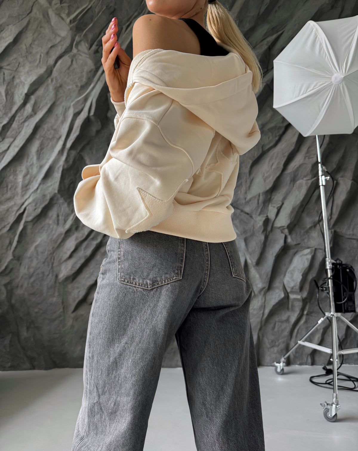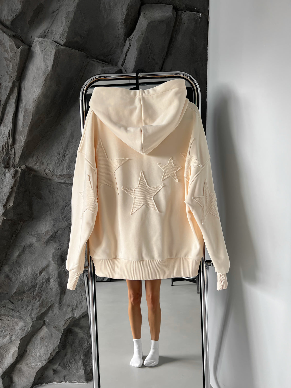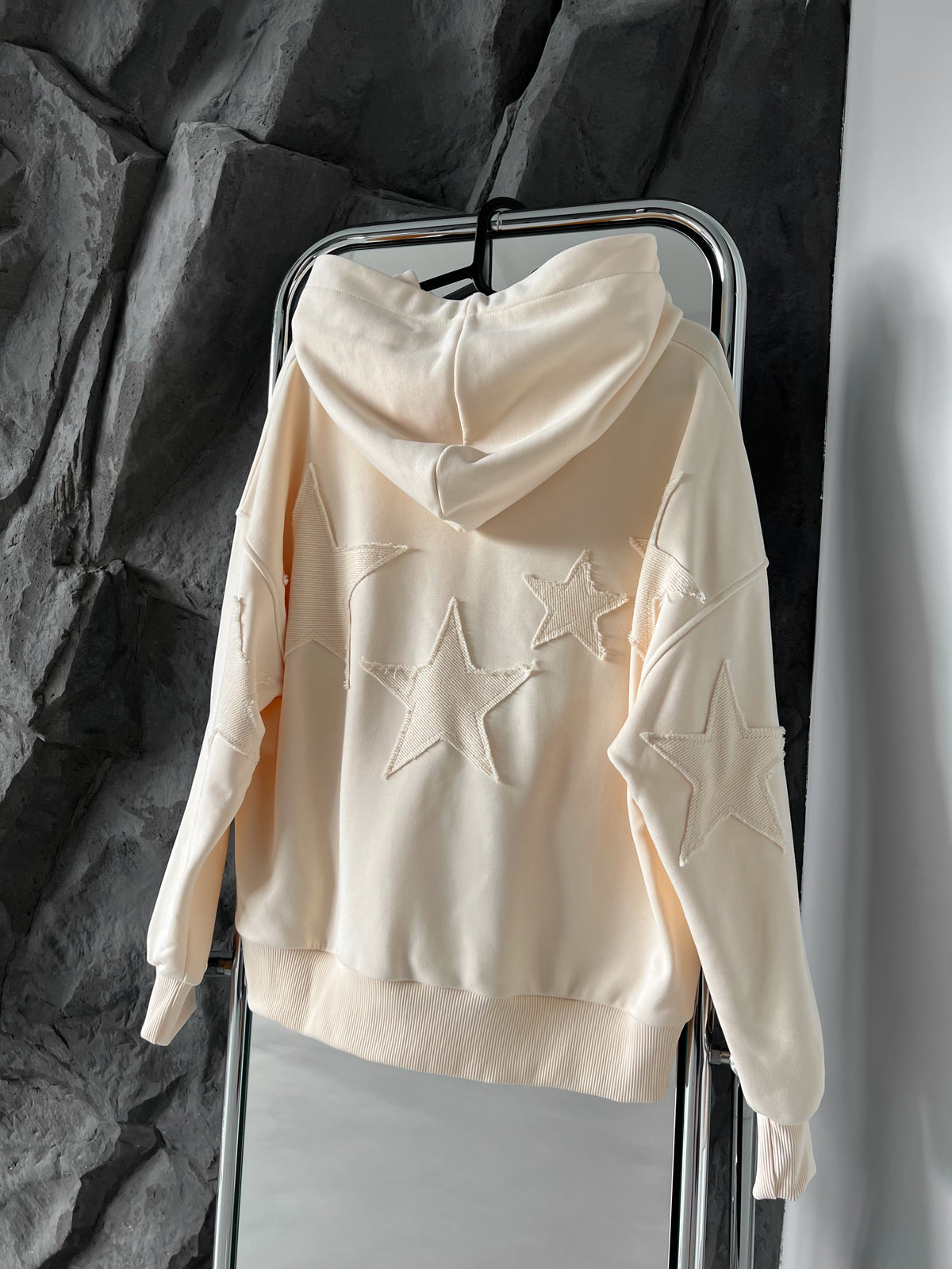 Džemperį puošia taip pat mūsų kurtos žvaigždės ir estetiškas, prabangiai žėrintis pieno baltumo užtrauktukas.